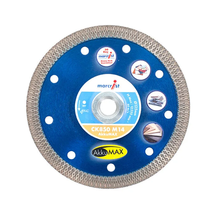 AkkuMAX Fliesen- und Feinsteinzeug-Diamanttrennscheibe für Nass- und Trockenschnitt für die professionellen Fliesenleger, die kabellos und leistungsstark auf einem Akkuwinkelschleifer alle Fliesen inkl. Feinsteinzeug zuverlässig und ausrissfrei schneiden möchten. Die Scheibe erzeugt eine extreme Schnittpräzision und ist optimiert für Akku-Winkelschleifer. • Bündigschnitt wird jetzt einfach und kostengüstig • Kein Flansch auf der Vorderseite erforderlich • Nie wieder beschädigte Oberfläche durch den Maschinenflansch
