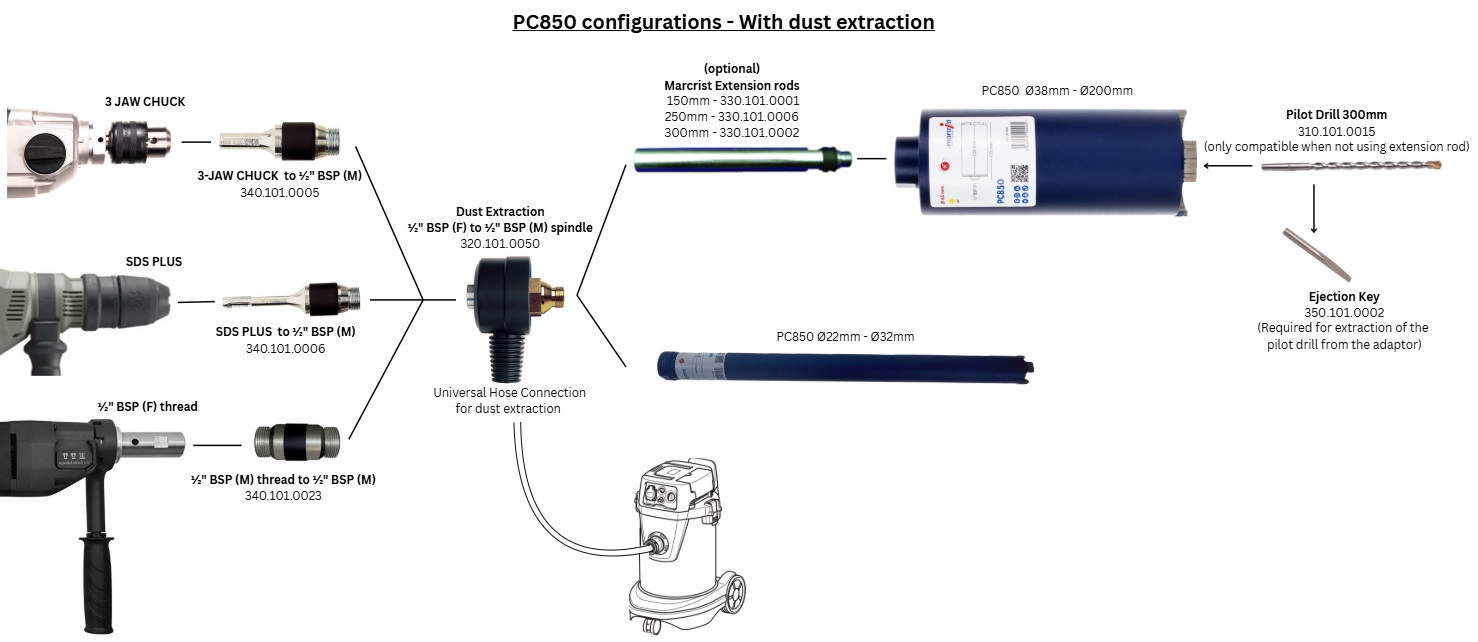 Anschluss ½" BSP, Einsatz mit Diamantbohrmaschinen und Schlagbohrmaschinen mit Softschlag. KS weich bis extrem hart, Beton bis B45, Klinker